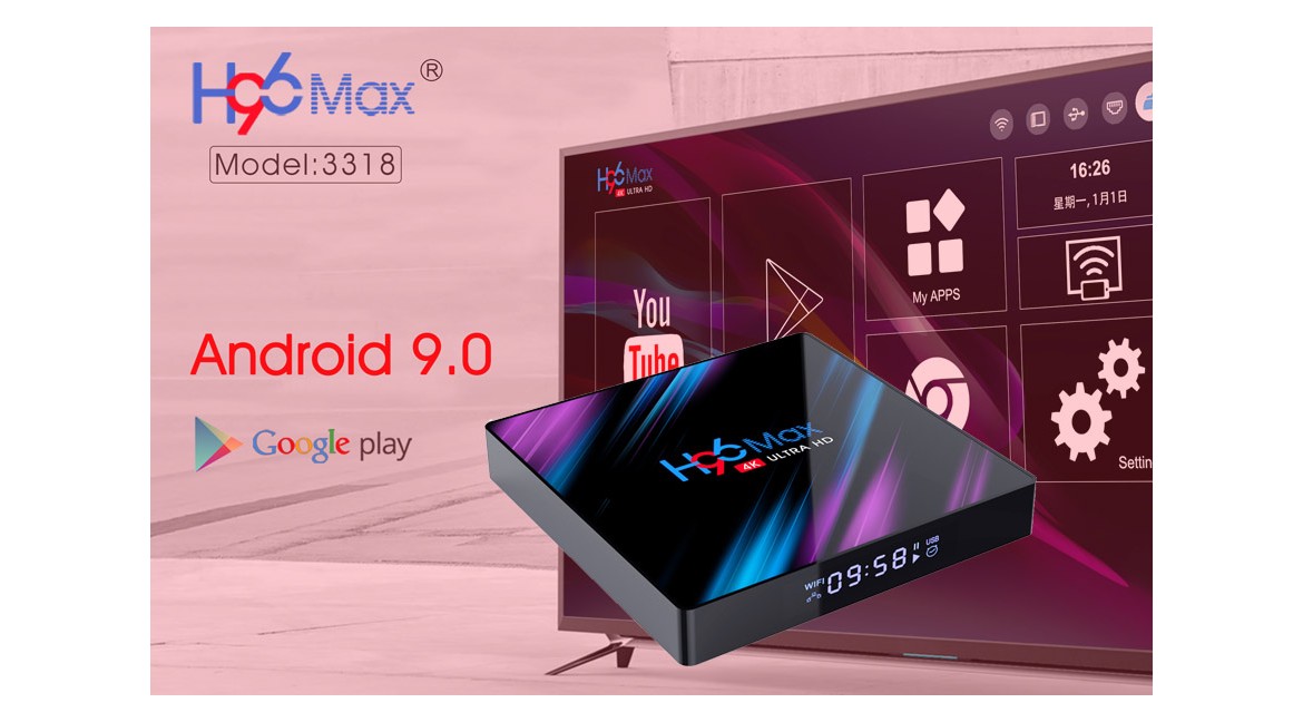Brand NameH96 Max Rk3318Android OSAndroid 9.0CPURK3318 Quad-Core 64bit Cortex-A53GPUPenta-Core Mali-450 Up To 750Mhz+WIFIBuilt In 2.4G /5G 802.11 A/B/G/NUSB Interface1 High Speed USB 3.0 ,1 USB 2.0Power SupplyDC 5V/2ASupport Photo FormatHD JPEG/BMP/GIF/PNG/TIFFSupport Music FormatMP3/WMA/AAC/WAV/OGG/DDP/HD/FLAC/APESupport Media FormatAvi/Ts/Vob/Mkv/Mov/ISO/Wmv/Asf/Flv/Dat/Mpg/MpegHigh Definition Video Output4K (4096×2160 Pixel )Network FunctionRKMC 18.1 ,Neflix,Vudu,Skype Chatting,Picasa,Flicker,Youtube,Facebook,Online Movies,EtcRAMDDR3 2GB and 4GB ROMEEMC 16GB And 64GB